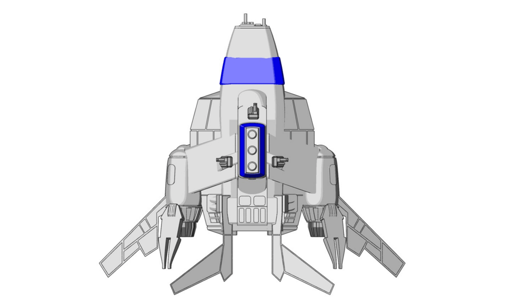 This particular version of the ship is based entirely on the ship silhouette that Agents of Gaming included in their EA Playtest Pack materials. I took that silhouette and extrapolated the rest of the ship from there, giving it elements of both the Hyperion cruiser and Kestrel shuttle.